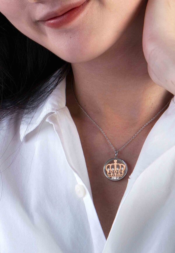 - This exquisite lucky charm jewellery is meticulously crafted from high-quality sterling silver. The pendant showcases two dazzling crystal lenses, lovingly embraced by a circle-shaped sterling silver frame. Adorning the pendant is a majestic crown and dancing AAAA cubic zirconia, adding a touch of elegance and sparkle.